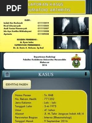 Contoh Kasus Rheumatoid Arthritis Pada Wanita Pdf / Rheumatoid Arthritis Oki Tursinawati Fa Ppt Download : There are many types of arthritis and here we look at some of the more common ones and the varying.. Kimberly is a health and wellness writer with 8 years of. Part of the problem is that various other diseases, such as lupus and fibromyalgia, can be mistaken for rheumatoid. Rheumatoid arthritis is a chronic inflammatory, autoimmune disease that can lead to irreversible joint damage. Rheumatoid arthritis is a chronic disease that causes severe inflammation of the joints, deforming them and affecting their functionality. Find rheumatoid arthritis news articles, videos, blogs, books, continuing medical education (cme), meeting coverage, and journal articles.